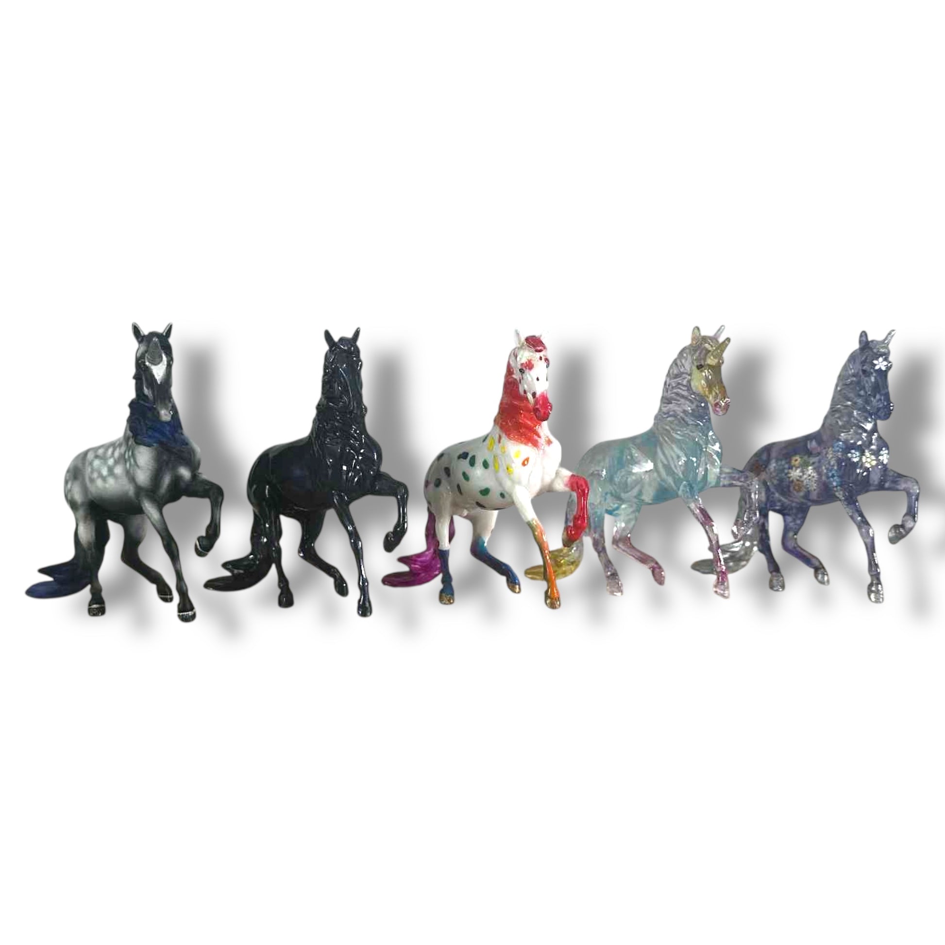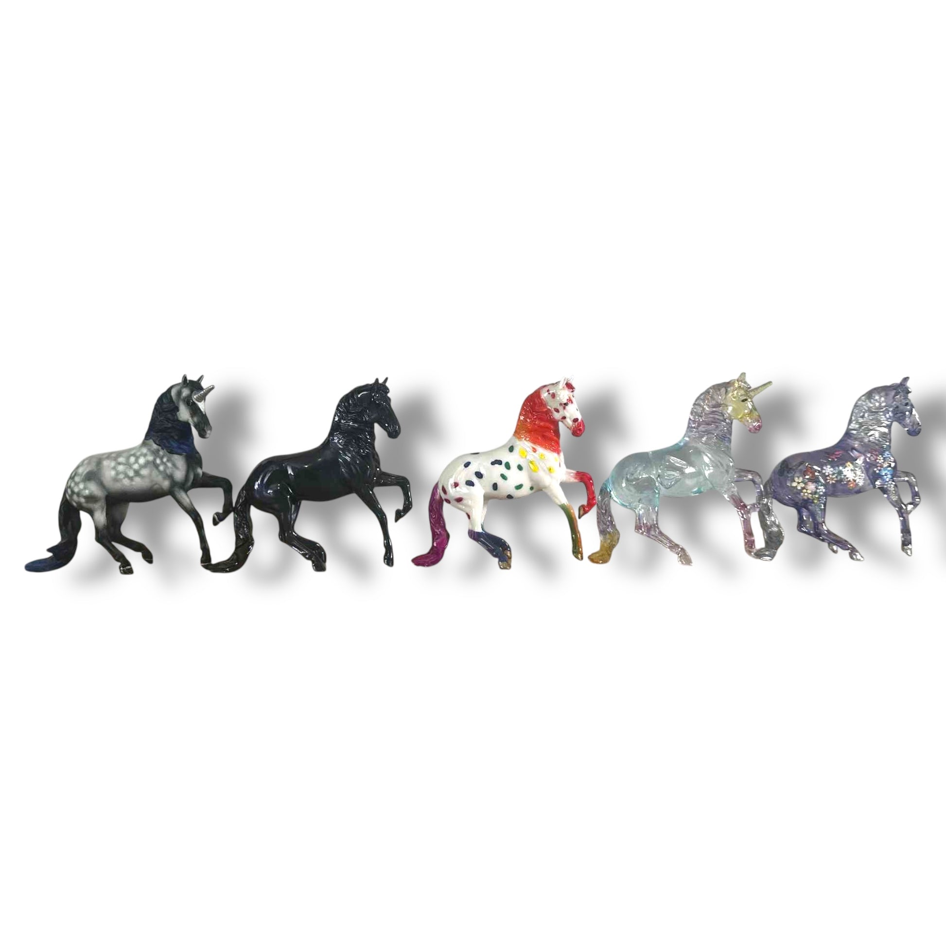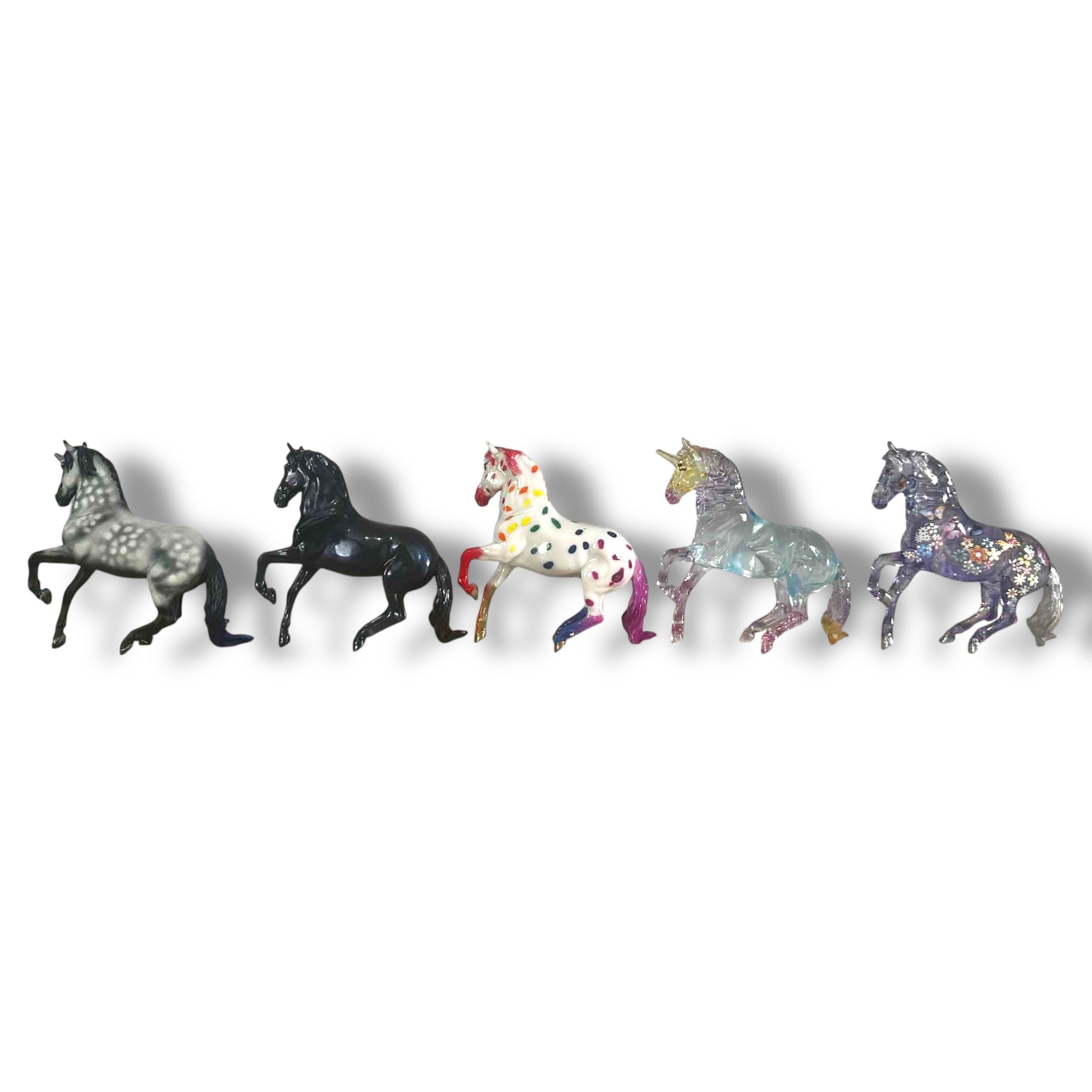 A fun mix of Alborozo Stablemates, each sold separately. Most are classic horse finishes, with one unique unicorn custom in the group!