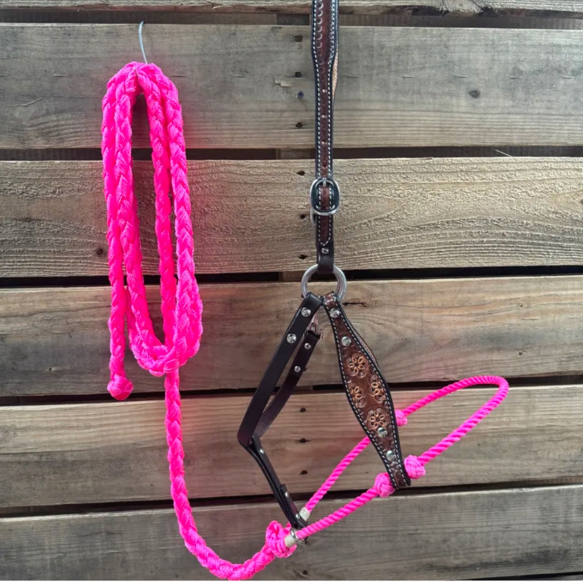 The Flower Power Hybrid Lariat & Leather Combo Halter combines function and style, making it both a useful training tool and a fashionable statement. Crafted from two-tone leather with intricate floral tooling, this hybrid halter pairs a durable leather frame with a lariat rope noseband for enhanced control and communication.